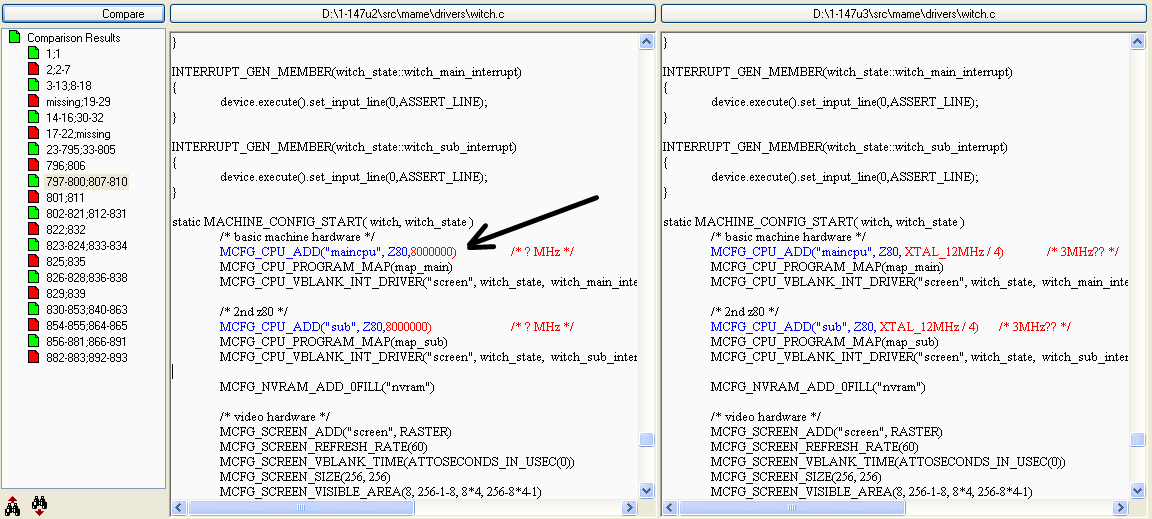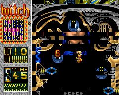 The gfx corruption is a Z80 CPU1 speed problem. In MAME 0.147u3 Brian Troha did a minor Witch update based on eBay auction picture. He changed the Z80 CPU1/2 clock speeds to 3MHz (see snapshot), and clone Pinball Champ '95 has now this gfx problem, but not the old parent version Witch (Sega License). If you changed the Z80 CPU1 back to 8MHz or to 4MHz the gfx was correct in all version (witch and clones witchs and pbchmp95). |