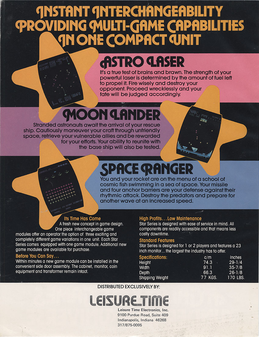 Moon Lander (bootleg of Lunar Rescue) is a black&white game. Read story at: http://pineconeattack.com/2009/08/18/moonlander-cocktail-cab/ and at KLOV: http://www.arcade-museum.com/game_detail.php?game_id=8746 MAME source says: "Leisure Time Electronics produced three games: Astro Laser, Moon Lander, and Space Ranger. The games were designed to be interchangeable with a universal cocktail cabinet which they designed and named "Star Series". The cocktail cabinets share the same artwork with all three games and has a different instruction card for each game. There were no upright or cabaret cabinets." |