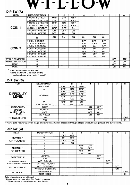 Default dip switches MAME settings are different in Willow US ver. According Willow USA manual the default setting for number of players is 1 and number of health is 4 |