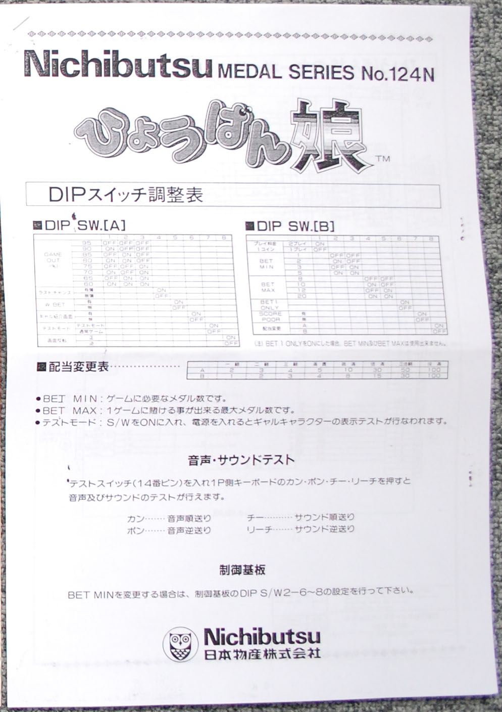 I find game manual (uploaded) Developers might understand it better, it's Japanese. It may be hard to see, I think these what it written: DIP SW.[A]: GAME OUT [%] LAST CHANCE W BET GAL SHOUKAI TEST MODE FLIP SCREEN DIP SW.[B]: PLAY ?? 1 COIN BET MIN BET MAX BET 1 ONLY SCORE POOL 配当変更 (google translate:Dividend Changes) |