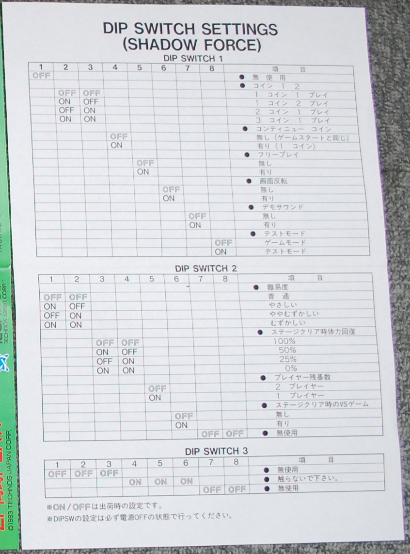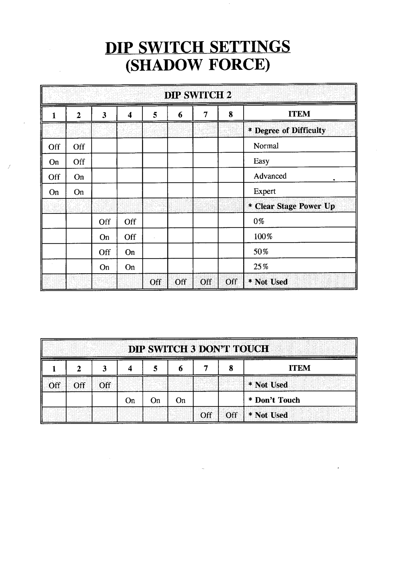 I've playtested all three versions of Shadow Force (shadfrce, shadfrcej, and shadfrcejv2) and experimented with their DIP switch settings. The printed DIP switch settings shown on the above image with the Japanese PCB seem to be pretty accurate in regards to shadfrcej and shadfrcejv2. The settings for DIP switch set 2 are as follow. Difficulty = SW1,2 (Easy and Hard seem to be switched on MAME) Normal = off, off Easy = on, off Hard = off, on Hardest = on,on Stage Clear Energy Regain = SW3,4 (values are set to 25, 50, 10, or 0 percent respectively on MAME) 100% = off, off 50% = on, off 25% = off, on 0% = on, on Player's lives = SW5 2 = off 1 = on Vs. Stage = SW6 No = off Yes = on SW7 and 8 are not used As for the U.S. version (shadfrce), there's a PDF of the operator's manual online (http://www.theboneyardpdflibrary.com/Arcadex5w2y6g9lp3sManuals/arcademanuals_s/Shadow%20Force%20%28Instruction%20Manual%29.pdf ), but the settings shown there aren't accurate. Here's my results. Difficulty level = SW1,2 Normal = off, off Easy = on, off Hard = off, on Hardest = on,on Stage Clear Energy Regain = SW4 (SW3 doesn't seem to work in the U.S. version. You either, get full health recovery between stages or you don't recover anything.) 0% = off 100% = on SW5-8 are not used in U.S. version. The current MAME settings for all three versions are based on the settings shown on the game's test mode, which seems to display inaccurate values due to a programming oversight. |