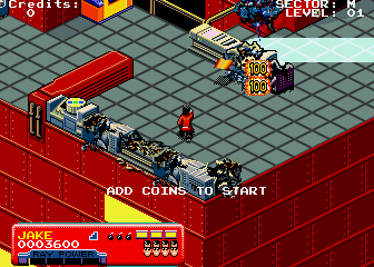 | Description | When using character to destroy enemy computer systems a graphics glitch occurs in the form of lighter colored horizontal bars. It can be seen in both attract mode and when playing first level. | ||||