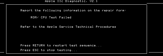mess apple2c -flop1 "A2eDiagnostics_v2.1.dsk" ...... (failed test as shown on attached picture) mess apple2e -flop1 "A2eDiagnostics_v2.1.dsk" ...... (same test as above except it enter into the monitor on some of tests) mess apple2p -flop1 "diagnosticsII+.dsk" ...... (at the test screen, if press the Esc-key it starts to acting crazy) |