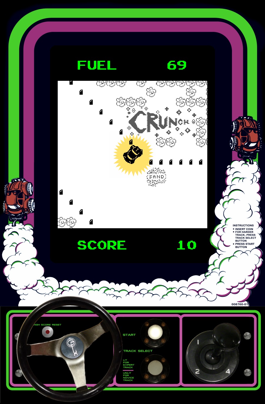 In the video attached you can see on the original cab that there is a green overlay on the top and bottom of screen where the timer and the score is. I know it's on the to do list in the mameinfo dat that the overlay for the car should also be a star burst. Just a friendly reminder as some of these bugs are forgotten about. https://www.youtube.com/watch?x-yt-ts=1422579428&v=N61Lacr9IGs&x-yt-cl=85114404 |