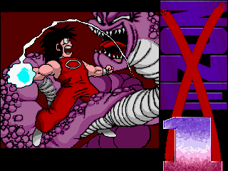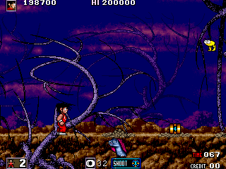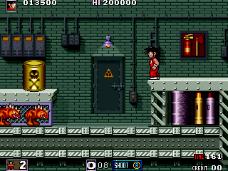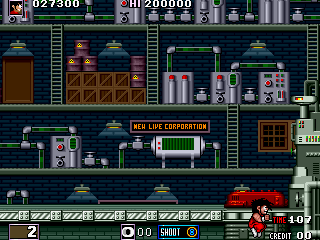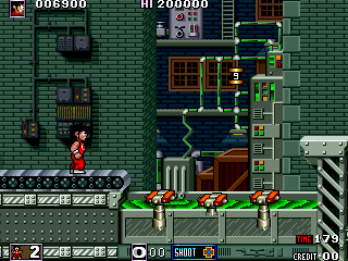 Reach the parts listed below. Level 1: 1) roughly 1/3 of the level - the lake of acid with the rising/lowering platforms; 2) roughly halfway the level - the part with the dashing red demons on the grate; 3) the end of level boss, upon entering its room; 4) after defeating the boss, when the character jumps in the sewers; 5) the screen after level complete. Level 4: 6) roughly 3/4 of the level - the part with the trees in foreground and the monsters that rise from the terrain. |