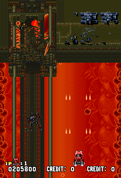 In stage 3, the monster swimming in the background erases the other sprites as it passes under them. Also, in stage 6, the bullets shot by the ground turrets pass behind the other sprites. |
