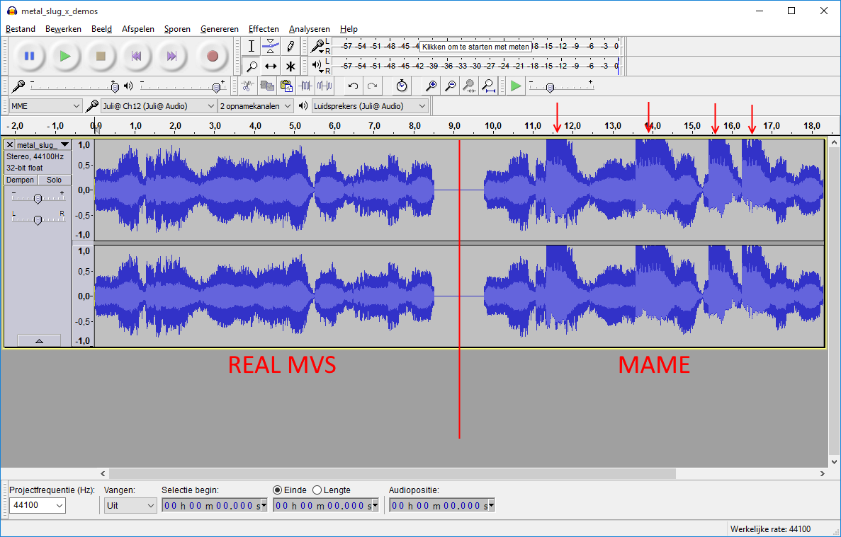 In the neogeo driver the volume balance between the YM2610 SSG and FM&ADPCM sound generation parts is incorrect. This manifests itself in -all- SSG based sound effects in the neo geo games to be played too loud versus FM and ADPCM and in some cases (because of clipping) also getting distorted. For example these SSG sounds include the bonus pickup sounds in the metal slug games, the train riding sounds in mslugx, the helicopter bomb dropping sounds, steam "noise",etc. Since the bonus pickup sound in the metal slug games is making the issue very clear, I've zoomed in on that for the comparison attached to this bug report. Do note that the comparison holds for other SSG sounds too. Thanks to ufoufo512 from the arcadecontrols forum, who provided me with a number of recordings from his MVS two slot board, we've been able to verify this and analyse what the (more) correct volume is. I've attached three files. The first is an MP3 comparing the real MVS with MAME (metalslugx_demo2_bonuspickup(real_vs_mame).mp3). This example is from the metalslugx demo that is played in atrtraction mode and zooms in on the bonus pickup sounds. The first 8 seconds is from the real MVS, then a pause and then the exact same part in MAME (recorded with -wavwrite). It's quite clear that the SSG volume in MAME is way too loud. I've also attached a picture showing the Audacity audio profile of this sample. In this picture it can be seen how the bonus pickup sounds are causing quite some heavy clipping (distortion), marked by the red arrows. The volume balance is set at this part in the neogeo driver: The current values are: MCFG_SOUND_ADD("ymsnd", YM2610, NEOGEO_YM2610_CLOCK) MCFG_YM2610_IRQ_HANDLER(INPUTLINE("audiocpu", 0)) MCFG_SOUND_ROUTE(0, "lspeaker", 0.60) MCFG_SOUND_ROUTE(0, "rspeaker", 0.60) MCFG_SOUND_ROUTE(1, "lspeaker", 1.0) MCFG_SOUND_ROUTE(2, "rspeaker", 1.0) MCFG_NEOGEO_BANKED_CART_ADD("banked_cart") After extensive testing I found the (more) correct volume for the SSG / channel 0 to be: MCFG_SOUND_ROUTE(0, "lspeaker", 0.28) MCFG_SOUND_ROUTE(0, "rspeaker", 0.28) MCFG_SOUND_ROUTE(1, "lspeaker", 1.0) MCFG_SOUND_ROUTE(2, "rspeaker", 1.0) To illustrate the difference this makes, I've attached a second mp3 (metalslugx_demo2_bonuspickup(real_vs_mame_volume_adjusted).mp3) where you can hear the same soundpart again, but now with the volume adjustment applied. So first 8 seconds is the real MVS, short pause and then the MAME sound output with the volume adjustment. Please let me know if there are any questions. EDIT: Through additional testing I found that the most accurate volume for channel 0 should be between 0.28 and 0.29. This setting is achieved by additionally lowering the channel 1 and 2 volume very slightly: MCFG_SOUND_ROUTE(0, "lspeaker", 0.28) MCFG_SOUND_ROUTE(0, "rspeaker", 0.28) MCFG_SOUND_ROUTE(1, "lspeaker", 0.98) MCFG_SOUND_ROUTE(2, "rspeaker", 0.98) This makes the audio balance between SSG and FM and ADPCM -very accurate-. I don't think people would be able to distuingish it anymore from the real deal in a blind test :-) |