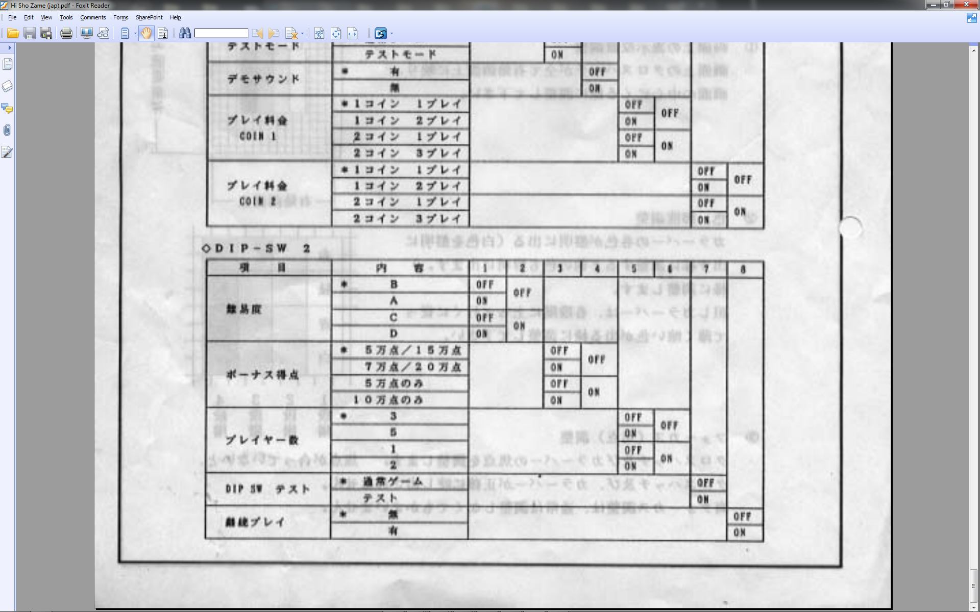 otokaru.net is a pretty good website for Japan factory defaults, since it's pretty much impossible to find manuals online. Here's the page for Hi Sho Zame: http://otokaru.net/contents/dipsw/ha-ho/hishozame.html Hi Sho Zame is a very peculiar Toaplan release in that it uses the 50K/150K extend setting usually found in world releases (Japan releases usually have 70K/200K), and has continues disabled by default. Currently, continues are enabled in MAME. This and a lot of other Toaplan (and Japanese '80s) games also run in cocktail mode by default, which is currently not the case in MAME. I don't know what MAME's policy on the cocktail dip is. I'm not sure about the other releases, but I imagine Flying Shark uses the same dips at least (which is a rarity). A Sky Shark manual I found has some really wacky "recommended" settings; difficulty A, extend at 100k only, etc. I get the impression you're shipped a board with the Japan defaults and expected to press buttons yourself... I also just found out that Time Pilot '84 is supposed to be difficulty 2, not difficulty 3: http://otokaru.net/contents/dipsw/ta-to/timepilot84.html |