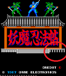 Lowest section of the title screen graphic is corrupted. also happens on the real (bootleg) board. The 'gap' and the " - "chars at the bottom however does not. |