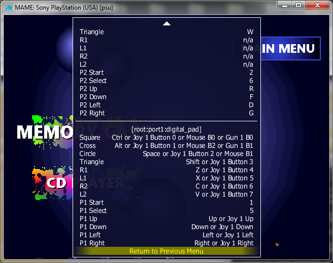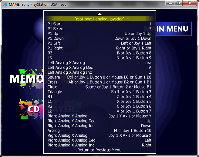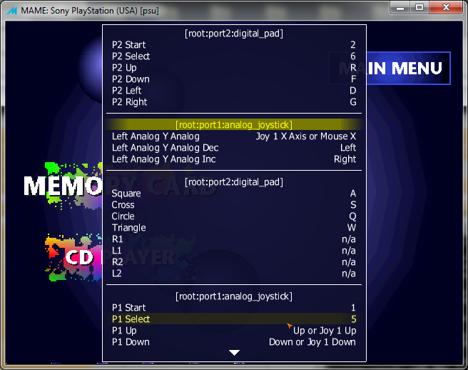 The Dual Analog controller had 3 different modes: Digital mode (no leds on) ---(press 'analog' once)--> Analog mode (similar to the Analog mode in the Dual Shock Controller, Red LED on) ---(press 'analog' a second time)--> Analog Flightstick mode (emulates the very expansive Playstation Analog joystick, Green LED on) ---(press 'analog' a third time)--> return to Digital mode But the input emulated in MAME Seems to only have 2 different modes: Digital (which runs ok) and "the second mode" which I'm not sure if it's the 'Analog mode' or the 'Analog Flightstick mode', as the emulated input doesn't have a visual feedback yet. If you press analog a second time, it's return to digital mode. Well, when this "second mode" is active, some input changes in this way: original input -> (changed to original possition of) [ ] (square) -> L1 /\(triangle) -> R1 R1 -> /\(triangle) L1 -> R2 R2 -> [ ] (square) Other inputs (X, O, L2, start, select, digital pad, analog sticks) aren't messed up |