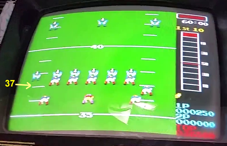 License and copyright text are missing in attract mode (see Automat_10yard-1.png). In the arcade the 5x player block stand at the 37 yard line (see Automat_10yard-2.png) and in MAME at the 38 yard line (see MAME-188_10yard.png). Arcade pictures from this YouTube Video: (link removed because the video has been deleted) |