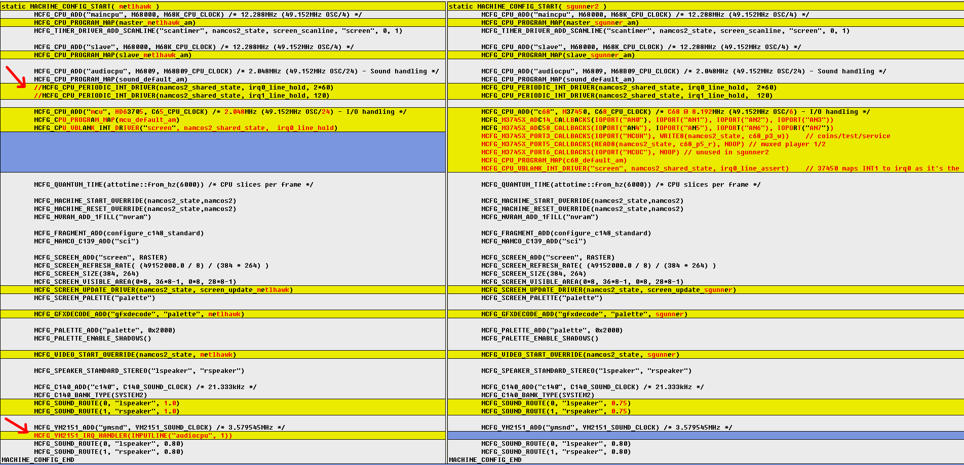 Missing sound in Metal Hawk since MAME 0.182 Angelo cut out this from metlhawk MACHINE_CONFIG : //MCFG_CPU_PERIODIC_INT_DRIVER(namcos2_shared_state, irq0_line_hold, 2*60) //MCFG_CPU_PERIODIC_INT_DRIVER(namcos2_shared_state, irq1_line_hold, 120) See https://git.redump.net/mame/commit/?id=179883f35ee104169e31fcc20d79281d029a396b hap says that it introduces a conflict with a: MCFG_YM2151_IRQ_HANDLER(INPUTLINE("audiocpu", 1)) b: MCFG_CPU_PERIODIC_INT_DRIVER(namcos2_shared_state, irq1_line_hold, 120) But if you readded the 2x MCFG lines and remove MCFG_YM2151_IRQ_HANDLER(INPUTLINE("audiocpu", 1)) like in the sgunner MACHINE_CONFIG it compiles and the sound worked again! See MACHINE_CONFIG_metlhawk-sgunner.png |