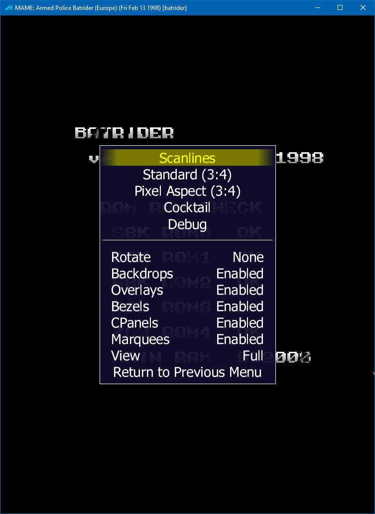 The issue happens with official and git versions. Mame is complaining that there is no "320x240x4.png" file, as you can see on mame.ini the "effects" are off and if you delete mame.ini this still happens. If you go to video options the "Scanlines" are enabled, if you turn it off, the issue is gone, but it get back if you select scanlines again. |