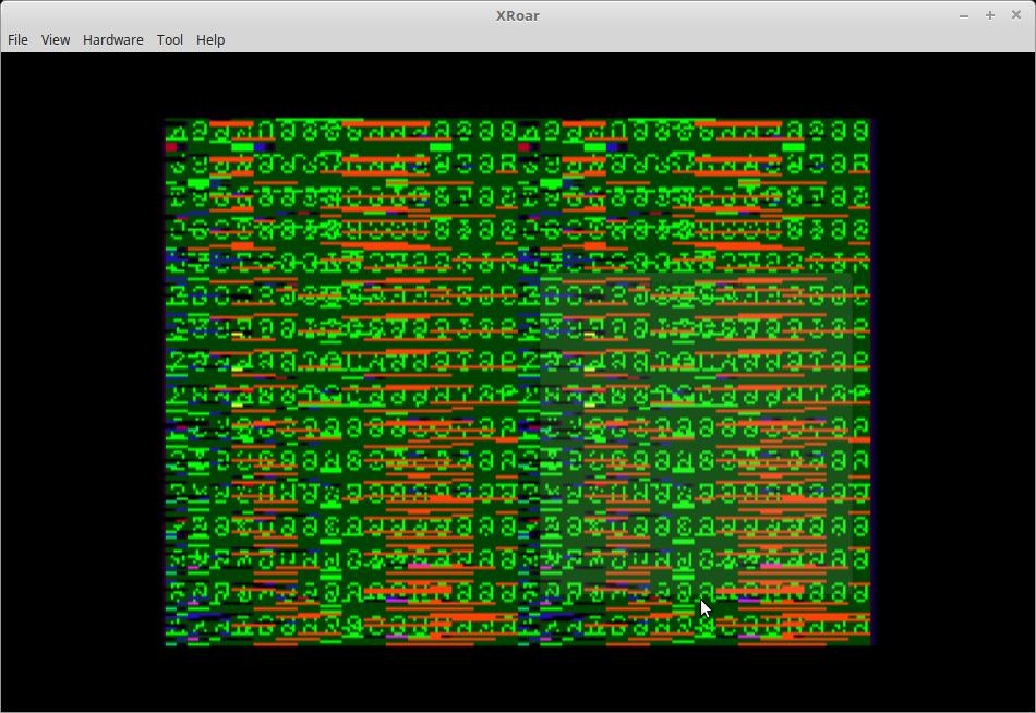 The following code will issue a double-speed POKE for the whole system: 10 POKE &HFFD9,1 20 GOTO 20 This will cause video screen corruption on a real Coco as the SAM/VDG can't keep up with the refresh rate. XRoar seems to emulate this correctly and you should see the following screen I've attached (screen corruption). The screen in MAME will remain unchanged and you will see the screen intact. |