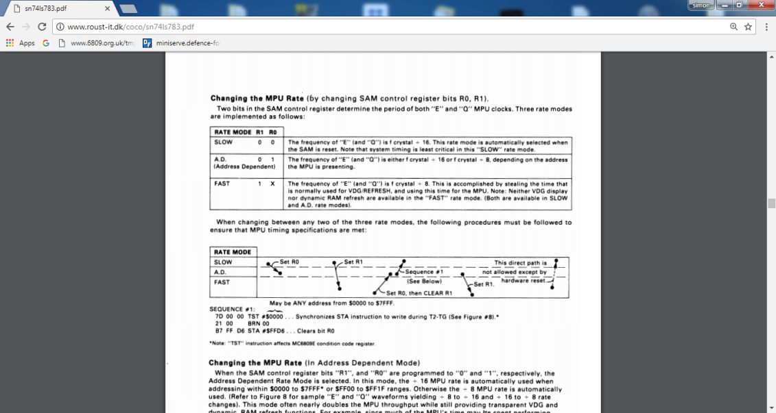 More info from the developer (Simon Jonassen): read the third section of the first table (from the new image I attached). $ffd6 (clear) / $ffd7 (set) control adress dependant fastmode $ffd8 (clear) / $ffd9 (set) control FULL fast mode the only place you can do FULL fast without video losses is in the horizontal and vertical borders ! we sometimes use this trick to give more clock cycles per scanline NORMAL clock speed is .89Mhz (NTSC clock / 4) that will give you 57 cycles per scanline fastmode will give you 114 cycles per scanline so you can enable fastmode in a vertical border and turn it off again before you reached the visible display mame just maintains the visible display no matter what, and that is NOT the correct behaviour ! the coco3 does NOT suffer from this malady (by design) |
