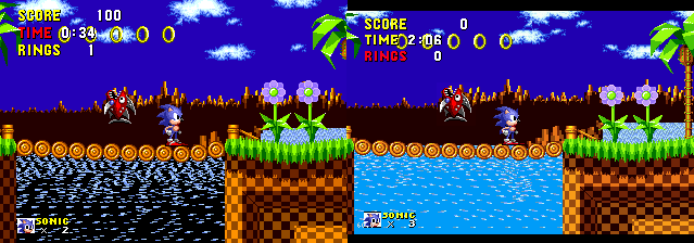The water color in mp_sonic's Green Hill Zone is completely different from the Genesis version, is that correct? It should be blue, not black with blue spots. It's not marked video incorrect. Snapshots (Mame left, Genesis right) |