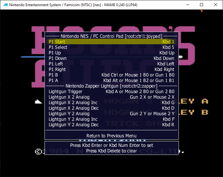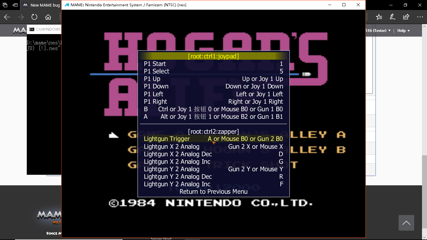 I have a nes game rom "Hogan's Alley (JU) [!].nes" I run mame in commandline: mame64 nes -cart "Hogan's Alley (JU) [!].nes" -mouse -ctrl2 zapper Then I play game. But only A in keyboard works as trigger. Mouse B0 doesn't. |