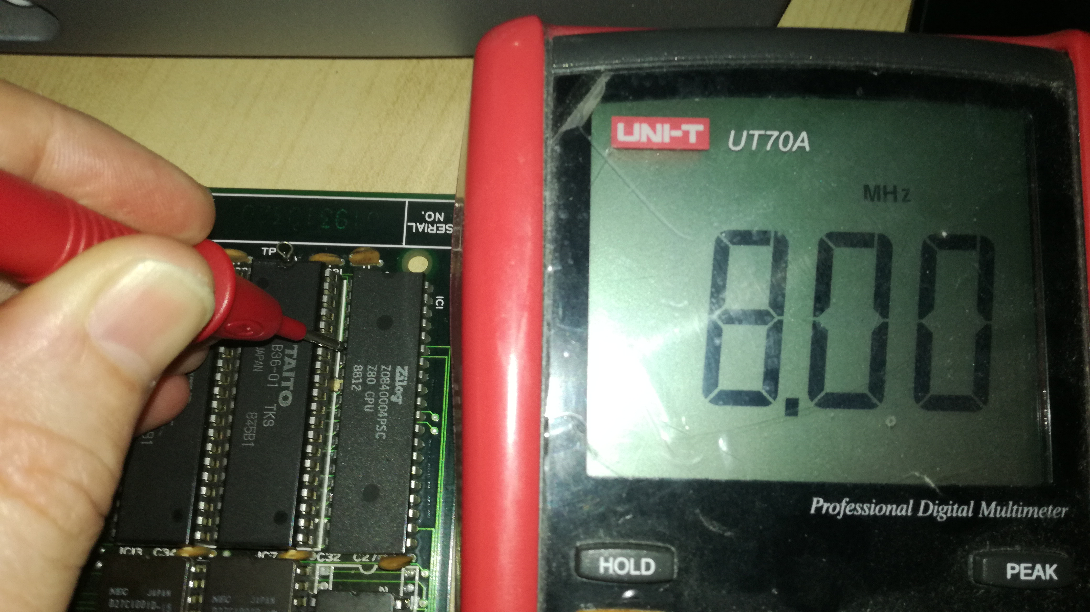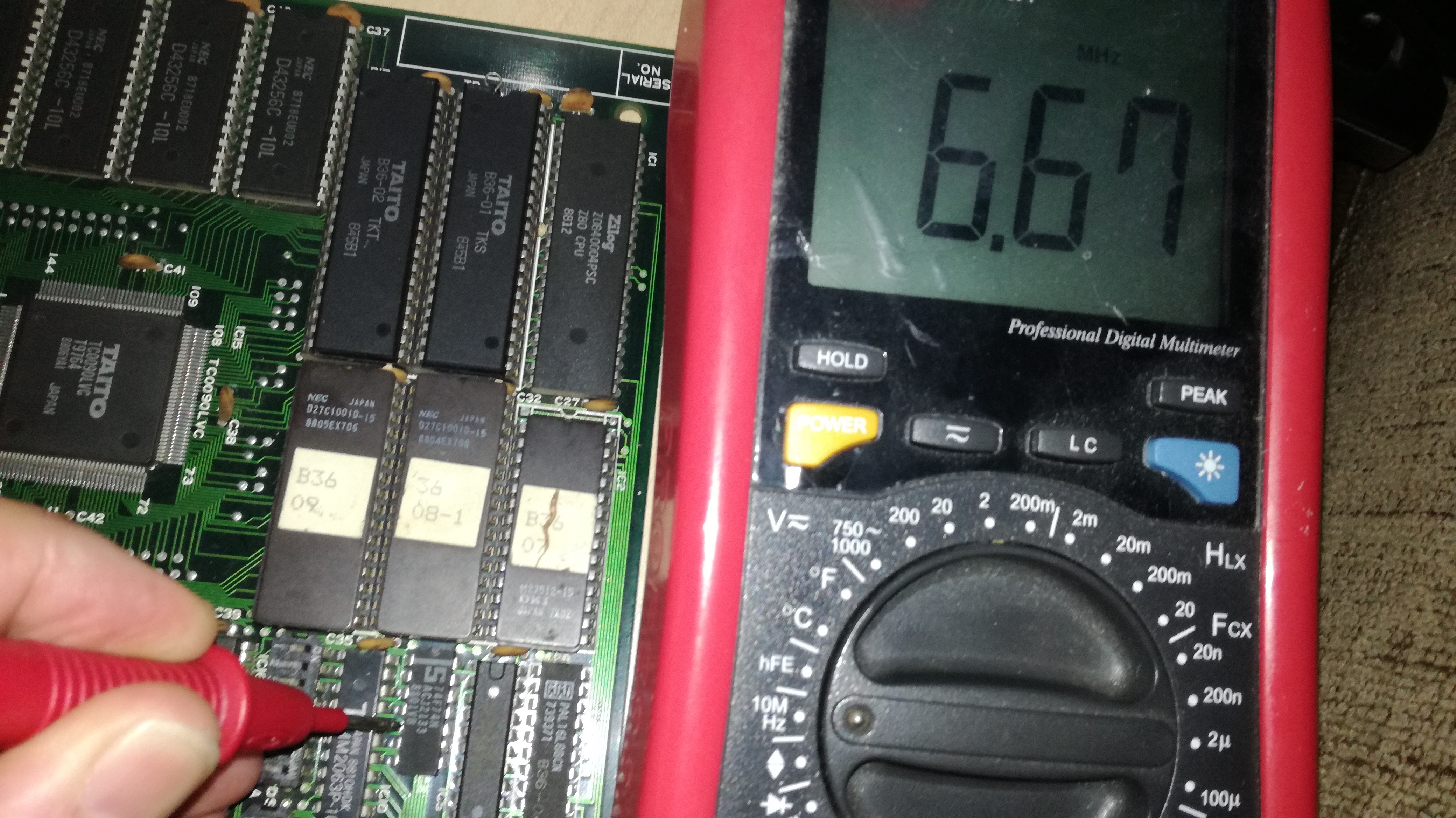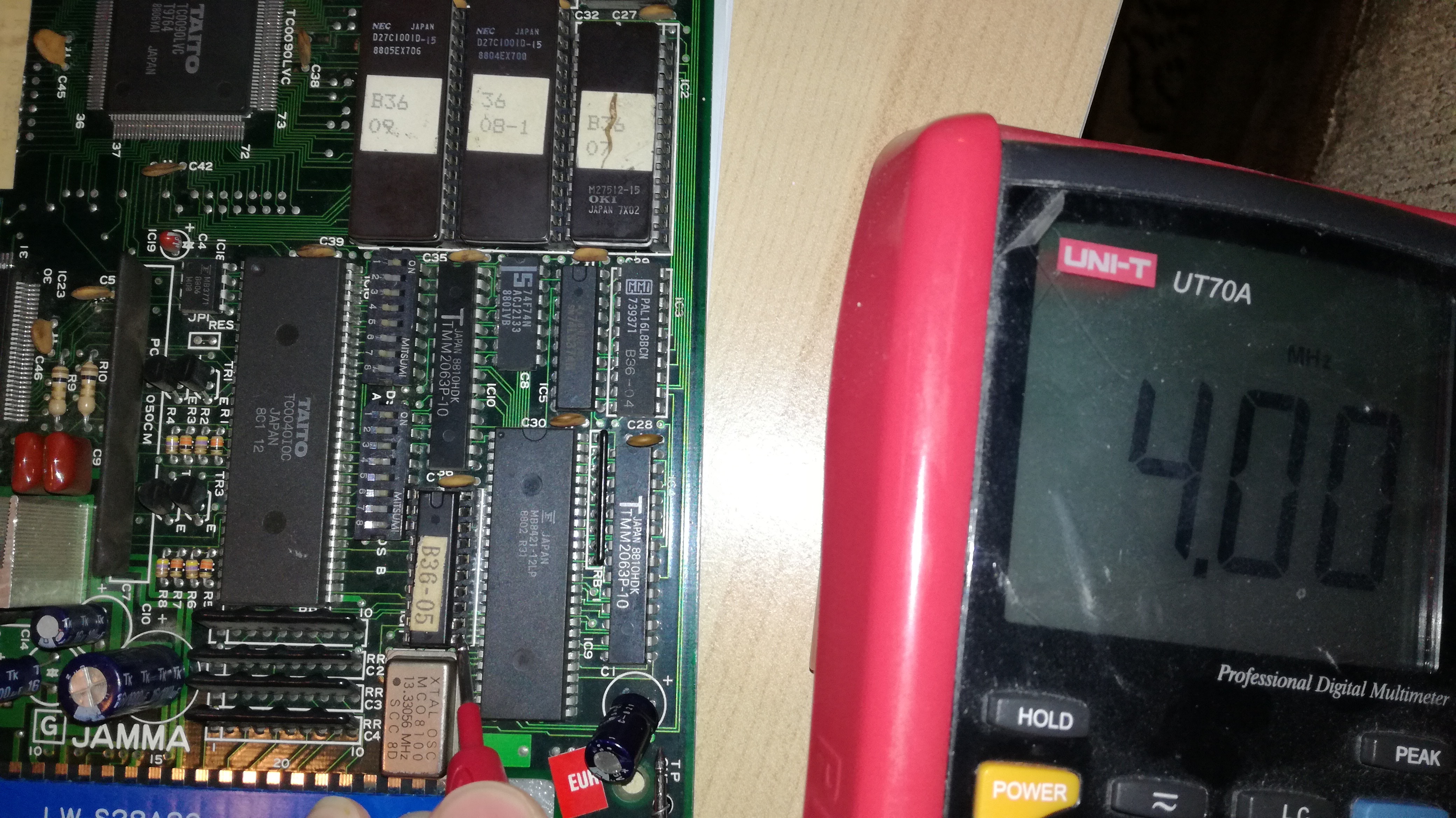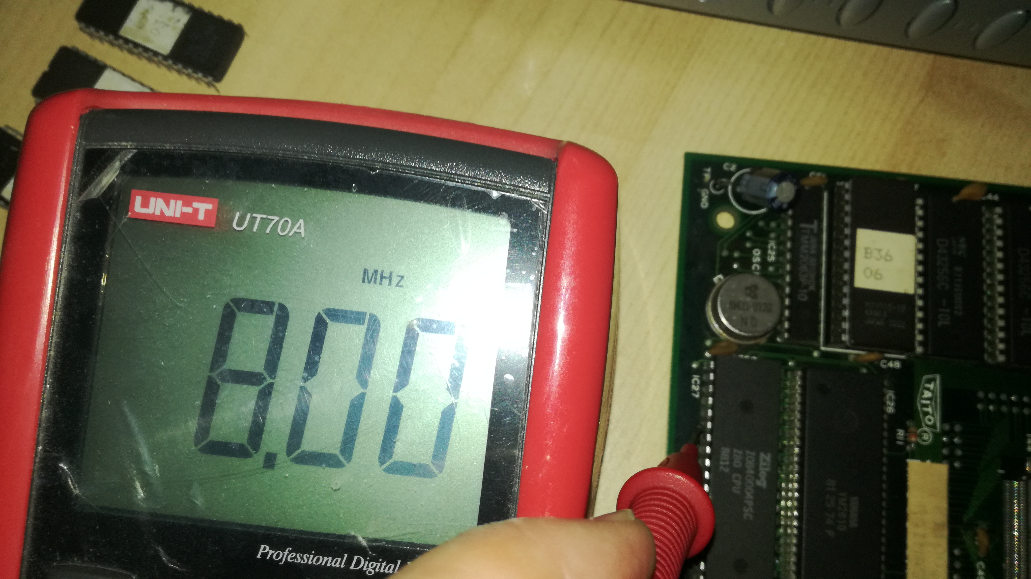 Hmmm, this is rather strange. Pin 6 of the slave and audio CPUs are both connected to pin 12 of PAL B36-05 @ IC11. The equation for pin 12 is simply passing through whatever is received on pin 11 (according to running jedutil on the B36-05 PAL dump from Porchy's site). Pin 11 of the PAL is connected to pin 1 of the 8MHz oscillator. I've managed to find the datasheet for that oscillator (attached) and it looks like it can do internal dividing of the master clock frequency to output either 8MHz, 4MHz or 2MHz on three different pins. So, going by the datasheet, pin 1 (OUT 2) should be a 4MHz output and pin 2 (OUT 1), which is connected to pin 63 (master clock input) of the YM2610, should be 8MHz. I've just checked the frequency on pins 11 and 12 of the PAL and, as expected, it's 4MHz on both (pic attached of pin 11 reading). I then checked pin 63 on the YM2610 and it's 8MHz, as expected. I then double checked the frequency on pin 6 of both the Z80's and it's still showing as 8MHz. How does that work when pin 6 of both Z80's is connected to pin 12 of the PAL and that pin is showing a 4MHz reading?? |