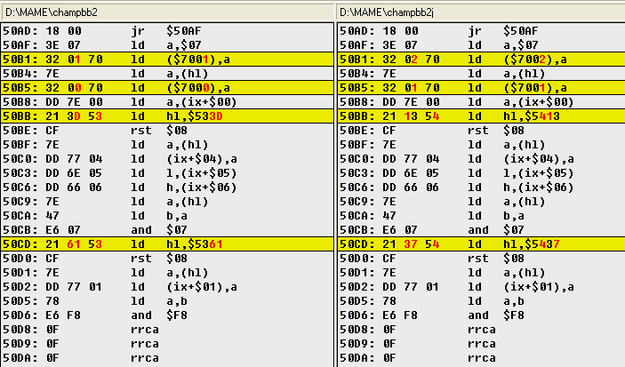 The parent set Champion Base Ball Part-2 (set 1) uses the address 0x7000 and 0x7001 to write commands to the AY-3-8910 chip, while the clone uses 0x7001 + 0x7002. See (DASM_champbb2-champbb2j.png) DASM of Champion Base Ball Part-2 (set 1) and clone Champion Base Ball Part-2 (Japan) History: - MAME 0.138: Added Champion Base Ball Part-2 (Japan) - MAME 0.168: The ALPHA-8201 device was added to the driver and Champion Base Ball Part-2 (Japan) that previously locked up at boot is playable. Discussion on MAME github: https://github.com/mamedev/mame/pull/3417 |