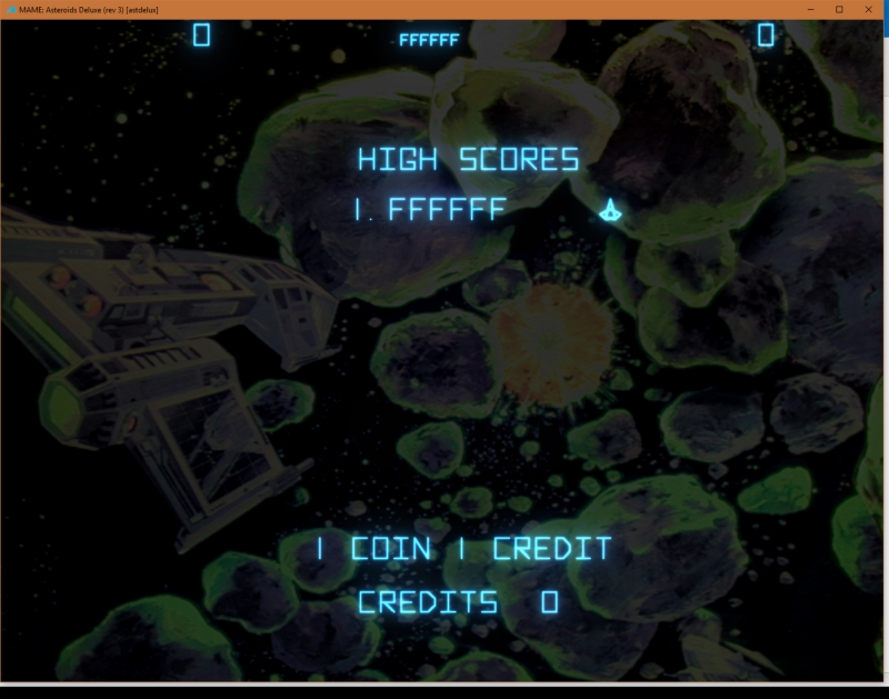 Launch astdelux Observe FFFFFs drawing in the high score areas before reverting to regular attract mode. |