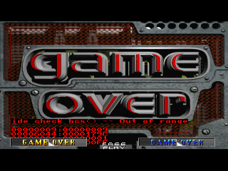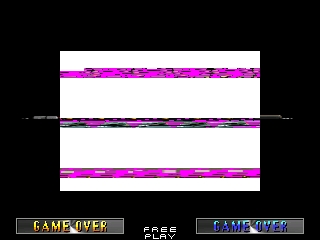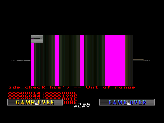 After I got a Game Over Screen without getting a high score in the game, the game didn't show the credits and instead displays garbage graphics (also, the sounds didn't play after that screen). After a period of time, the attract mode freezes during transition screen, and starting the game will go back to normal. This happens also on Area 51/Maximum Force Duo set except with an out of range message. Here is the credits screen for Maximum Force if you didn't see it: |
