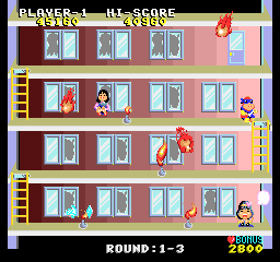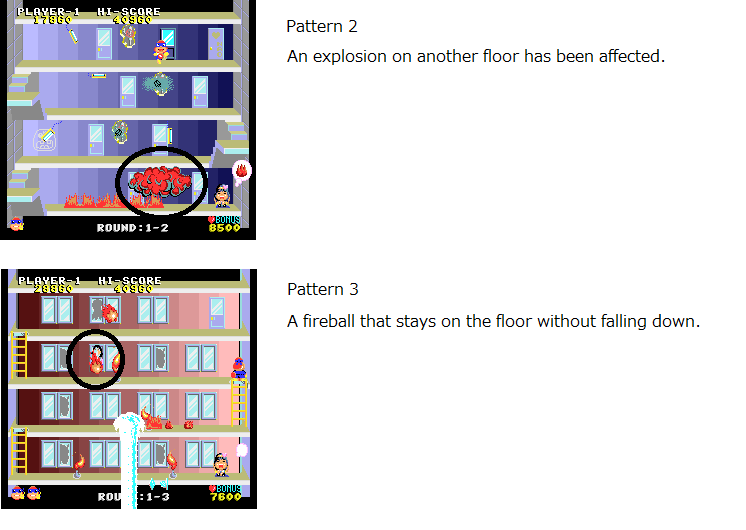 The problem that has existed since the beginning. In pattern 2, the gas explosion is a miss for the player one floor below. Similarly, a gas explosion on the bottom floor will be a miss for the player on the top floor. In Pattern 3, fireballs that sometimes fall from above may stay in the middle of the floor, making it impossible for players to move forward. |