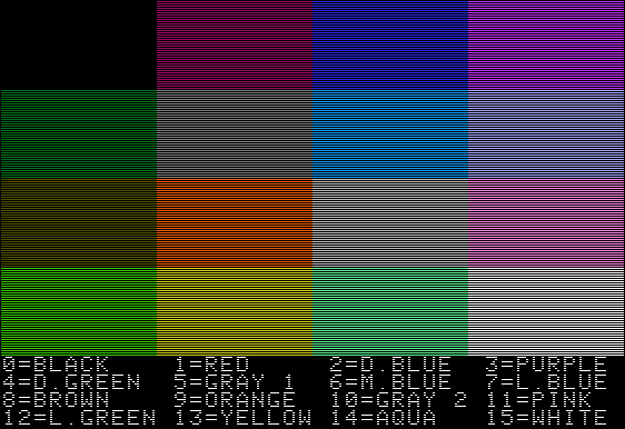 | Description | The graphics colors on the mame apple2 series are not matching the original machines colors. The file A2Ee.COLOR.DEMOSOFT.png shows a screenshot of the mame output of the COLOR DEMOSOFT program. Magenta is too light/red, Dark Blue looks like lavender, purple looks pink, Dark Green is not dark, medium blue is light, light blue is grey, brown is greenish. The file Apple_II_low-resolution_graphics_demo_2.png shows what the colors should look like. | ||||