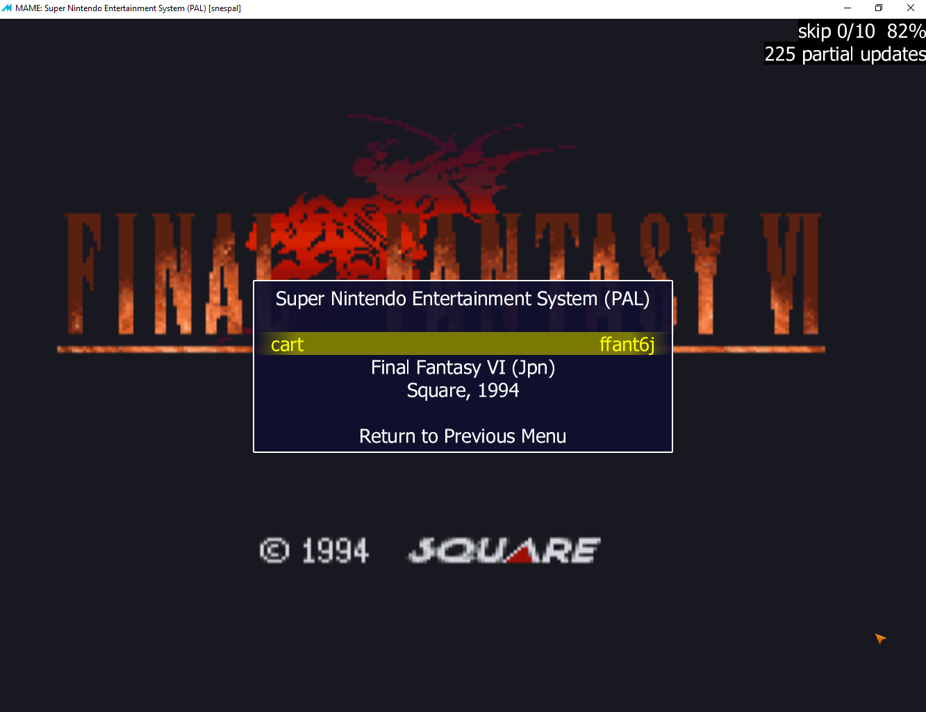 Back in the 90s, I used to have an adaptator in the hope to play Super Famicom (NTSC) on my Super Nintendo (PAL). In MAME (screenshot attached), I can run "Final Fantasy VI" on the snespal... It won't on the real hardware. |