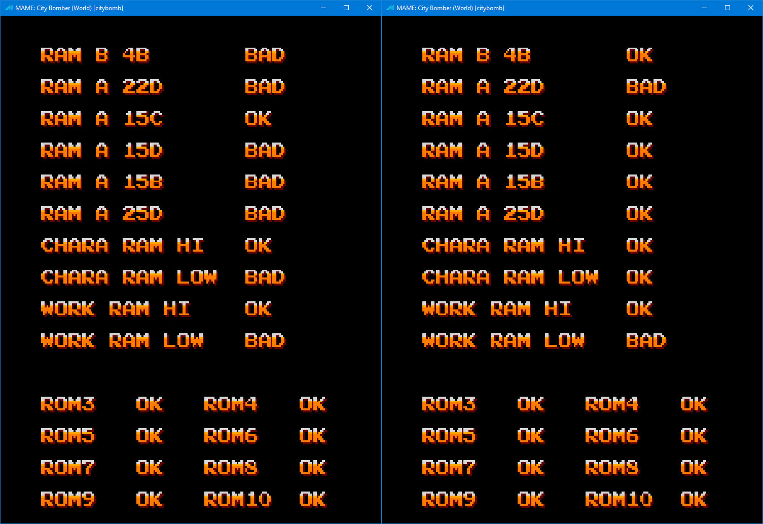 City Bomber works fine when you start it up like normal. However, doing a soft reset after the Ram/Rom check and the grid screen will cause to have a delayed soft reset causing to put the screen white still going for a bit with sounds and then end up doing a soft reset causing to get BAD rams, the how many BAD rams you get its different depending of what you were doing, like if you were at the title screen or during gameplay. While this is happening, the game will prevent to startup again, either close the game and re-launch it or do a Hard Reset. Posted 2 pictures in 1, The Left one (1st) its what i got when i did the soft reset during gameplay and the Right one (2nd) its when i did another soft reset after the 1st BAD rams. A similar thing happens with what i reported for Salamander: https://mametesters.org/view.php?id=7670 |