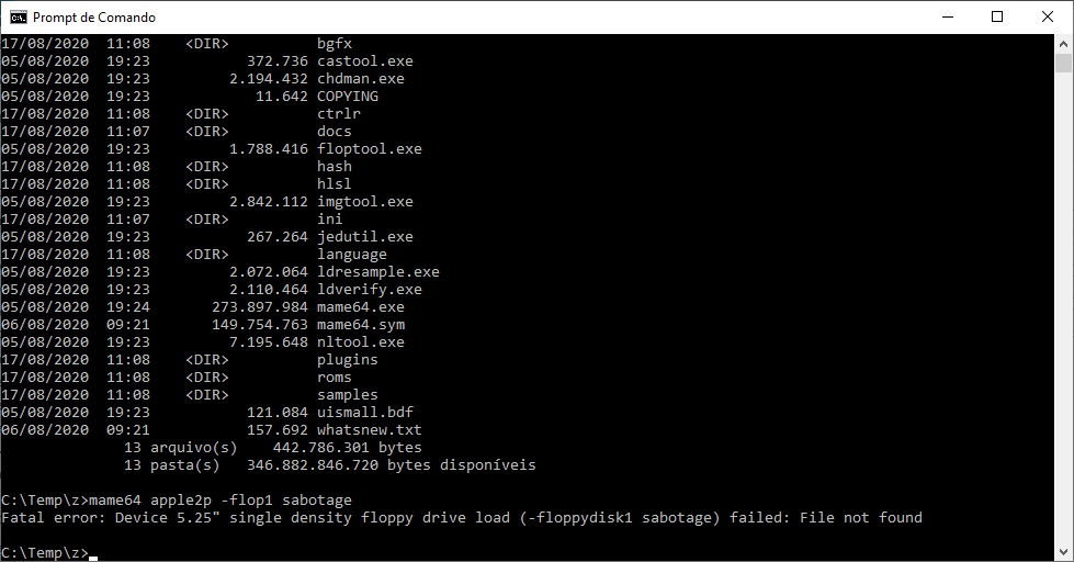 FWIW it works fine here with: mame64 apple2p -flop1 sabotage But I believe this could possibly cause the change in behaviour for your use case: https://git.redump.net/mame/commit/?id=cf078d736add075a78f488a3ec50c567d1a8fc29 EDIT: if I use -norc to tell MAME not to use the ini file, I need the following for it to run without the problem you encounter: mame64 apple2p -flop1 sabotage -norc -rompath "d:\emu\mame\software;d:\emu\mame\roms" |