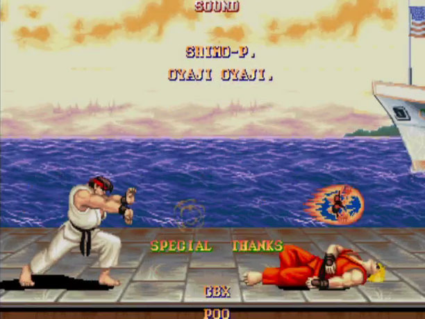 Finish game with any character using 1 credit and losing one round. Ending attract sequence will play with characters fighting each other When Ryu/Ken are fighting their fireball graphic is incorrect If you continue beating the game again in the same manor it may or may not be present Original pcbs don't seem to replicate this |