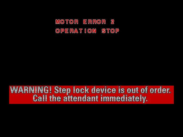 Alpine Surfer shows since MAME 0.125u3 only the message 'MOTOR ERROR 2 - OPERATION STOP'. And when you go into the Service Mode it shows after a while the message: 'WARNING! Step lock device is out of order. Call the attendant immediately'. |
