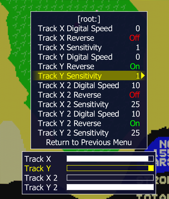 - Assign Mame Trackball analog X and Y to gamepad Left analog stick X and Y respectively. - See the MAME analog control settings screen and watch X and Y sliders decrement even when analog stick is not being touched. |