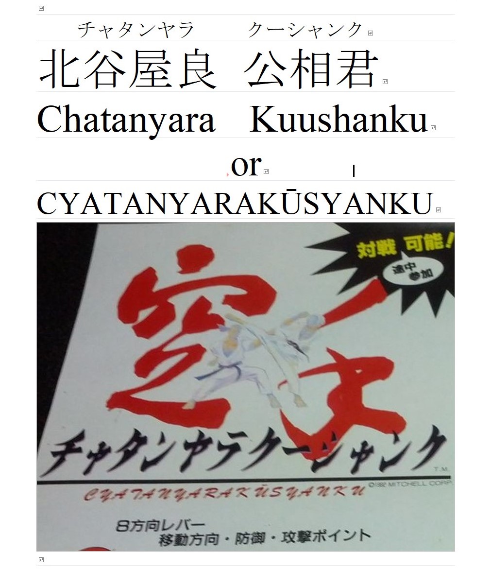 should be"Chatan Yara Kuushanku" or "CYATANYARAKŪSYANKU" more information about "Chatan Yara":https://en.wikipedia.org/wiki/Chatan_Yara about "kuushanku" (kūsankū):https://en.wikipedia.org/wiki/K%C5%ABsank%C5%AB_(kata) |