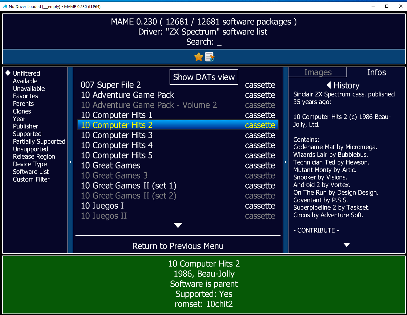 Make sure you have the History.xml in the History folder. - Start MAME.exe - Open any softlist, for example : ZX Spectrum. (like the attached screenshot) - Select any item, for example : 10 Computer Hits 2. (like the attached screenshot) - Click on the "Show DATS view" icon. |