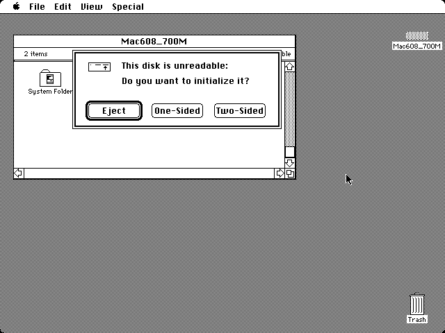 - Boot any Mac machine with high density drives from hard disk. For these steps I'm going to use the 6.0.8 HDD image in the software list (mame maciix -hard1 mac608) - After the OS boots, mount any 1.44 MB HD floppy in any drive. It will be recognized by the OS. - Eject the disk by dragging its icon to the trash. - Mount any HD floppy image. It can be the same disk or a different one, and it can be mounted in any drive. - The OS will fail to recognize the disk and "The disk is unreadable, do you want to initialize it" message will appear (screenshot attached) |