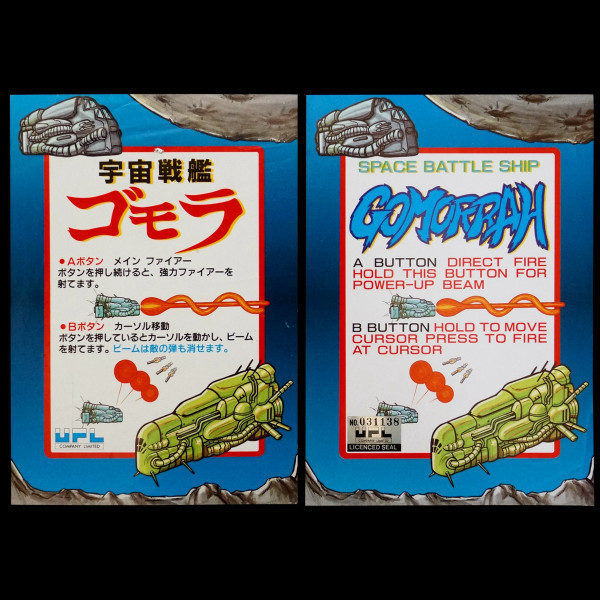 Even if not explicitly stated with a "For use in Japan" Space Battleship Gomorrah should at least be marked as such, since it's definitely one. Also arguably the title screen sports 宇宙戦艦ゴモラ, which should actually be transliterated with the romaji name "Uchū Senkan Gomora" instead? Regardless it definitely don't have the space in between "Battle" and "Ship" on the instruction sheet, postfixed in-game translitteration looks a typo to me given name is supposedly a pun of "Space Battleship Yamato". |