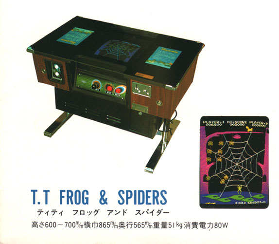 Scans of marketing materials and photographs of the screen from a surviving pcb show that the spiders are supposed to be drawn on top of the spider web. There is a photo on the advertisement that shows the squirrel drawn on top of the upper doorway in the tree. Unfortunately this is the pattern that MAME gets correct, but I’m certain that Taito intended all of these objects to take priority over the backgrounds. The large spider, swinging spiders, and squirrel all appear on the tilemap viewer. The frog and tadpoles appear on the tilemap as well, but they have no priority issues. The sprites for the free roaming spiders, the solo hanging spiders, acorns, bees, dragonflies, & butterflies are all drawn on top of the backgrounds correctly. The free roaming spiders have the correct priority when entering the tree doorways unlike the squirrel. I have uploaded an advertisement, a catalog photo, and a composite image of snaps showing the squirrel priority issue. The top tree doorway on pattern 3 appears to allow the squirrel to overhang the right edge of the door as shown on the advertisement photo. The priority issue is with the left edge of the door. Sales Flyer on Flyer Fever https://www.flyerfever.com/frog-and-spiders-jp/ Taito catalog listing for cocktail model (uploaded) Taito advertisement with 3 photos (uploaded) no image preview, so click the link An original Frog & Spiders board was playable at the Natsuge Museum in Japan during March 2017. Several visitors posted photos of the crt screen to twitter. These 2 show the title screen: https://twitter.com/_QtQ_/status/838021967940726784 https://twitter.com/utamatu1130/status/838007110239567873 This one shows the start of pattern 01, and the instruction card. https://twitter.com/nurunuru/status/840804486130024448 In addition to showing proof of the priority issues, these sources also show some graphic anomalies to be true to the hardware. For example, the large white square on the upper tree branch where one of the web strands attaches looks wrong to me. Yet it appears on all of the crt photos and promotional materials. Similarly the odd single green pixel on the upper left tree branch appears on the hardware too. |