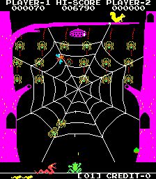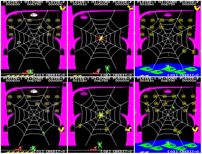 The small swinging spiders that appear in pattern 1 & pattern 3 are drawn behind the spider web. The large spider on the title screen and pattern 2 is drawn behind the spider web as well. The squirrel on pattern 1 and 2 is drawn behind the doorway in the tree, but drawn correctly on pattern 3. All of these objects are supposed to be on top of the background image. I saw the WIP note: 0.138u2: Angelo Salese fixed priorities in Frog & Spiders. But this is not a regression. I ran the game in MAME 0138 thru 0141 to see if this was fixed in 2010, but they all have the same priority issues as the current release. I understand that this is suspected of being a bootleg version, but I think it is more likely to be an emulation issue than a bootleg issue or btanb. |