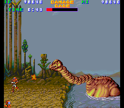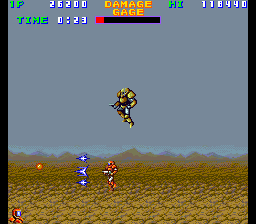 There appears to be a small line of graphics missing on a couple of characters. When on the green planet (Lagto Soa), the sea dragon is missing a line near it's rear and then a bit later on that level when you fight the boss, after you've destroyed his Robocop-like suit, when he jumps around in the air, sometimes there is a line missing on his head. Update by Stefan Lindberg: There is no line on the dragon on my PCB, that other line bug could i not check out because i never got past the dragon... |