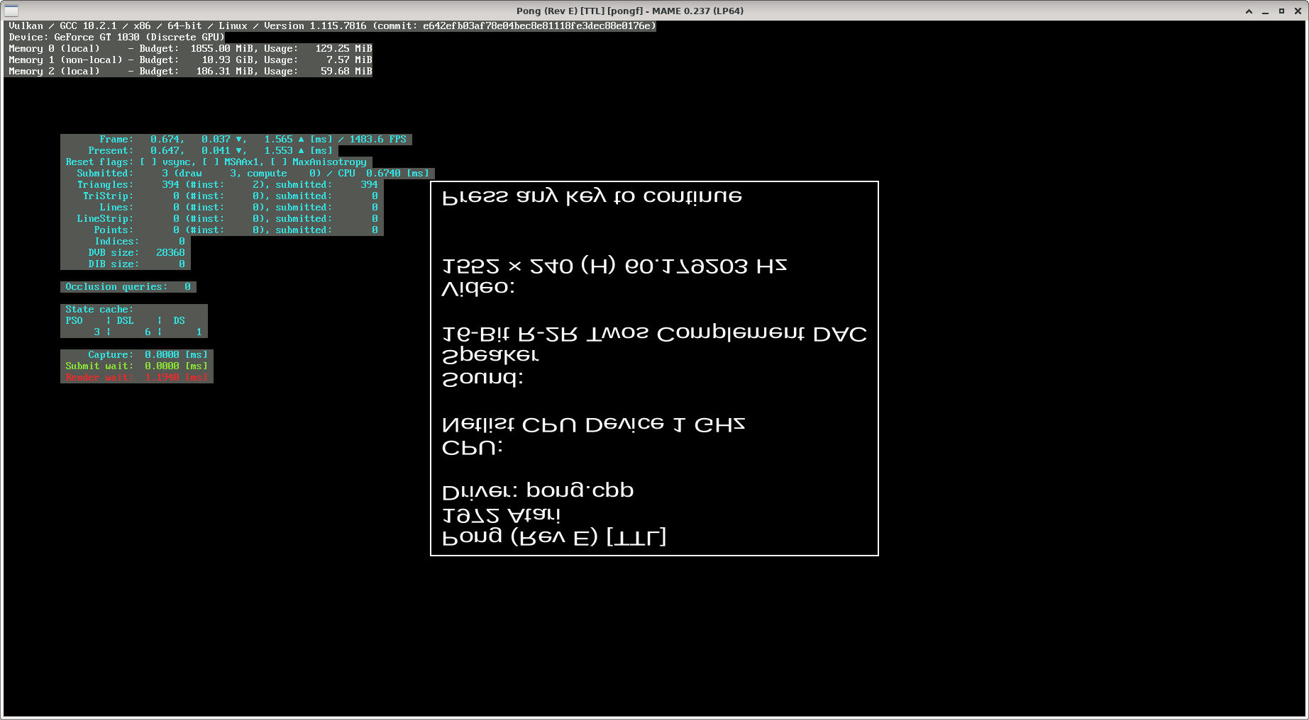 Happens here on Debian 11 Linux. Though I am using local compiled subtarget arcade. #>./sdlmamearcade64.V0237.Mainline pongf -video bgfx -bgfx_backend vulkan -bgfx_debug -window -skip_gameinfo I can't resize very much before it chokes or seg faults. V0228 Seems to choke as well but doesn't seg fault. Interestingly I left -skip_gameinfo on and noticed it was mirrored. (Uploaded). And I also got ALOT of warnings with -verbose enabled (Mame 0228 does not display these warnings nor was it mirrored) Starting Pong (Rev E) [TTL] Warning: Attempting to retrieve a nonexistent target 'temp' for screen 0 Warning: Attempting to retrieve a nonexistent target 'temp' for screen 0 ..... Note:Never used bgfx or vulcan before so not sure all is as should be on this machine. |
