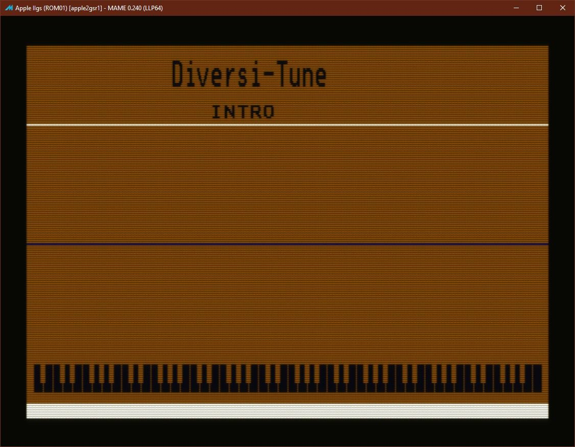 When running Diversi-Tune 1.1 self-booting 3.5 disk image splash screen loads and "Intro" screen appears, but then freezes and no sound is output. When Diversi-Tune 1.1 HD-installed application is run from GSOS 6.04 finder, initial menu is reached and works fine, but as soon as a song is loaded/played, emulation freezes and no sound is output. |