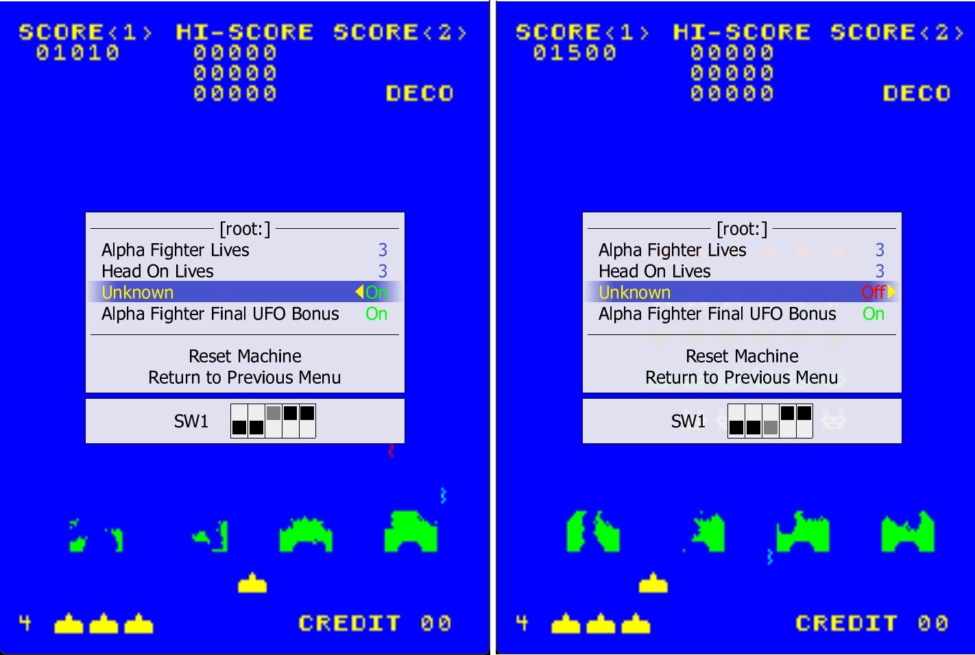 Load and run game. Select Alpha Fighter. Turn Unknown DIP 3 ON Play game until score reaches 1000 points, noting Bonus Life added to bottom left of screen. Set Unknown DIP 3 to OFF, and play game until score reaches 1500 points, noting Bonus Life has been added to bottom left of screen. Easy to reach Bonus Life points, but you can use "Bullet Invincibility" cheat if you have to. |