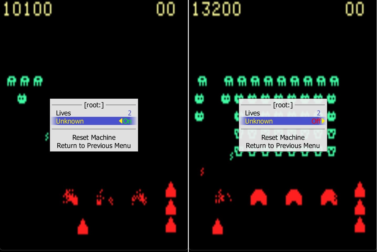 Load and run game. Turn Unknown DIP ON, RESET and play game until score reaches 10,000 points, noting a bonus life added to lower right of screen. Turn Unknown DIP OFF, RESET and play game until score reaches 13,000 points, noting a bonus life added to lower right of screen. |