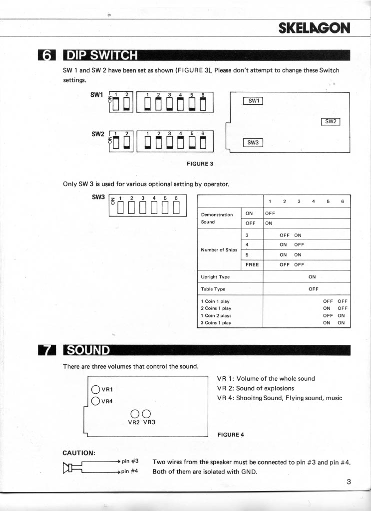 DIP Switch sheet pulled from manual shows "Demonstration Sound" DIP which is currently missing from these games. SF-X being a working clone of Skelagon can be used for determining if it is missing or not. Full manual with schematics available here: https://arcarc.xmission.com/archive/PDF_Arcade_Manuals_and_Schematics/Skelagon%20(Nichibutsu).pdf |