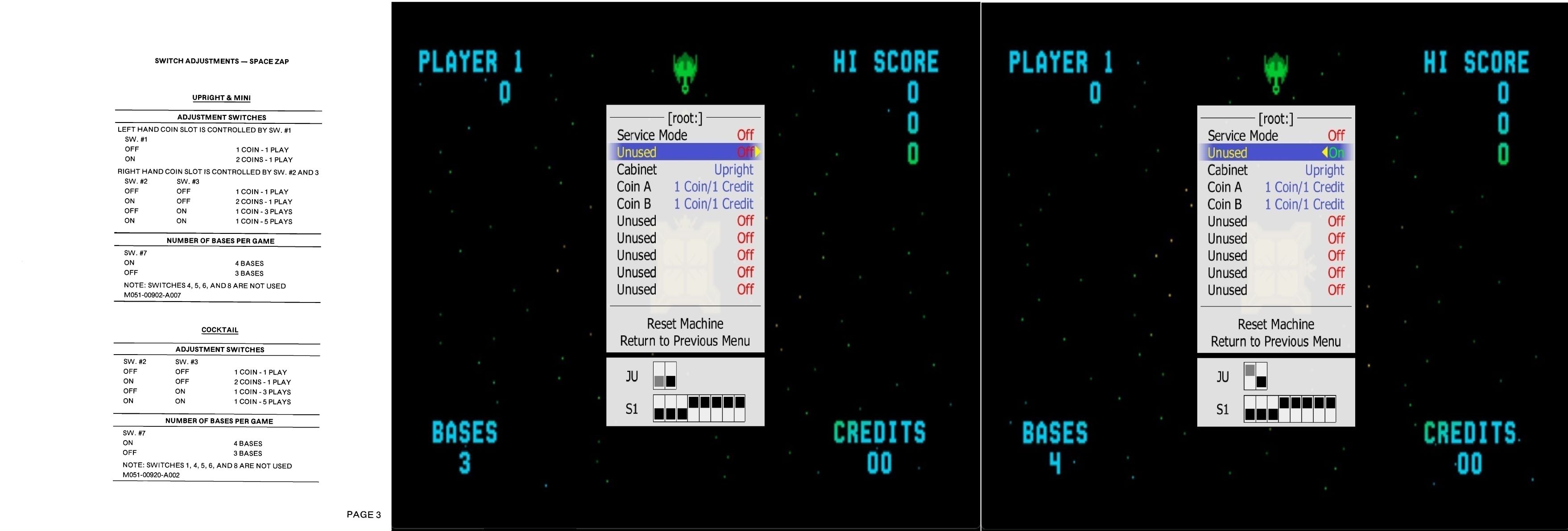 Picture below shows DIP Switch page pulled from Space Zap manual. Currently labeled "Unused" DIP activates Number of Bases given at the start of a game. OFF = 3 ON = 4 Please note it is also supposed to be Switch # 7. |