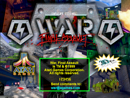 The game is titled "War: Final Assault" instead of "War: The Final Assault". It's also worth nothing that the trademark and copyright name in the game and on the bottom of the flyer use a comma instead of a colon (War, Final Assault) though the flyer uses the colon in the text. Flyer: https://flyers.arcade-museum.com/flyers_video/atari/11020801.jpg |