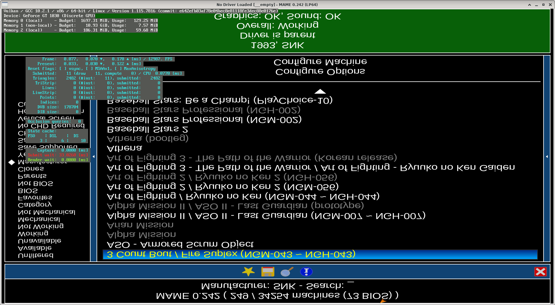 Ubuntu 20.04.3 totally updated in current date using kernel 5.17 FX-6300 3.5 GHz 6 cores and nvidia driver 470 GT 640 1 GB. Using SDLMAME 0.242. If BGFX is selected when mame is being started in main game select GUI even only rendering an simple list of games is being used all cpus cores and less of 10 % GPU usage at point not is possible start any game in 100 % speed. That problem happen if selecting both backend opengl or vulkan. If selecting instead opengl return the normal mame speed. That problem also is happening in windows or only in Linux ? |