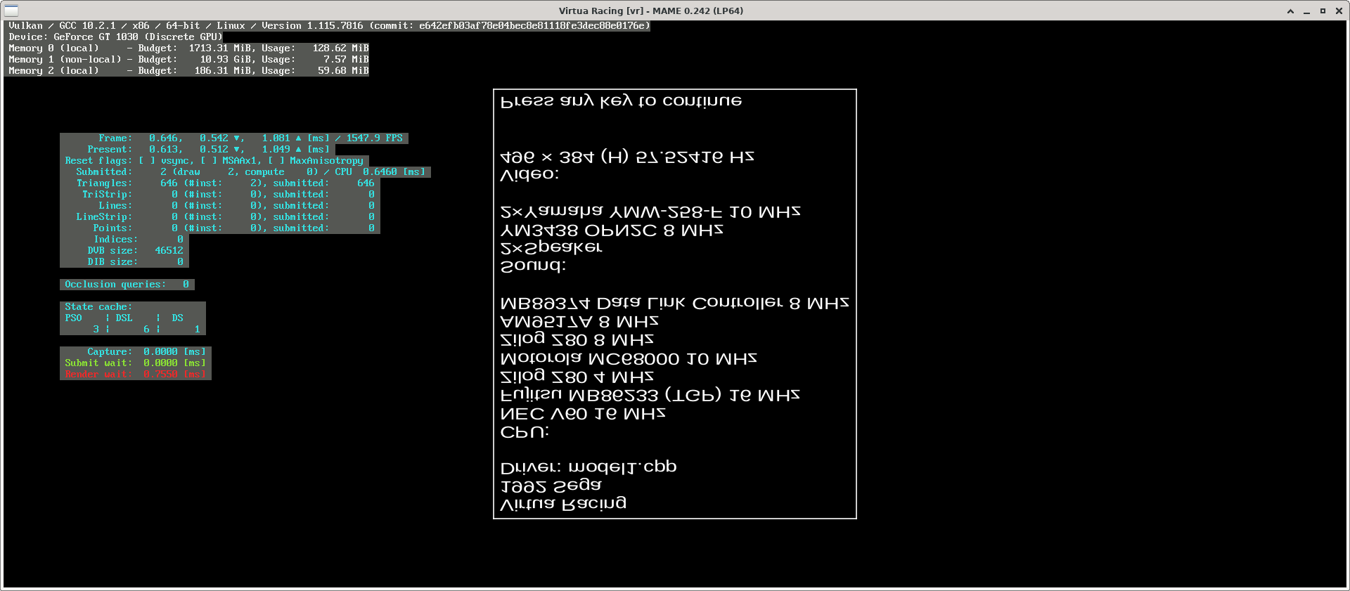 Augusto, I understand you mentioned opengl/vulkan are similar. Please confirm your GPU operation, see my notes below. Run mame with -bgfx_debug and confirm your running mode and device in the top left of the screen Please make sure when using Vulkan, MAME is running with GPU Vulkan drivers and not the MESA software implementation, I found Ubuntu 22.04 was selecting MESA lavapipe in for Vulkan on my system instead of the GPU icd file, lavapipe is MESA's software vulkan implementation I worked around this (i expect its a distro issue) issue here by forcing the Vulkan icd file at launch for my AMD card with (yours will be different): VK_ICD_FILENAMES=/usr/share/vulkan/icd.d/radeon_icd.x86_64.json ./mame ... --- kept for reference --- This seems to be happening for me, If rendering the gameslist only, $ mame -video bgfx -bgfx_backend vulkan Fullscreen: approx 30% usage all cores Windowed: approx 20% usage all cores $ mame -video bgfx -bgfx_backend opengl No impact, core usage remained pretty close to normal for system Running Virtua Racing $ mame vr Average speed: 100.00% (29 seconds) negligable change in core usage $ mame vr -video bgfx -bgfx_backend opengl Average speed: 100.00% (32 seconds) negligable change in core usage $ mame vr -video bgfx -bgfx_backend vulkan Average speed: 92.75% (28 seconds) approx 40-50% all cores $ mame -version 0.242 (mame0242) Distro: Ubuntu 22.04 LTS Kernel: 5.15.0-25-generic CPU: AMD Ryzen 7 3700X 8-Core Processor RAM: 32GiB GPU: Device: Advanced Micro Devices, Inc. [AMD/ATI] Ellesmere [Radeon RX 470/480/570/570X/580/580X/590] (rev e7) Driver: 4.6 (Core Profile) Mesa 22.0.1 Info: AMD Radeon RX 580 Series (polaris10, LLVM 13.0.1, DRM 3.42, 5.15.0-25-generic) |