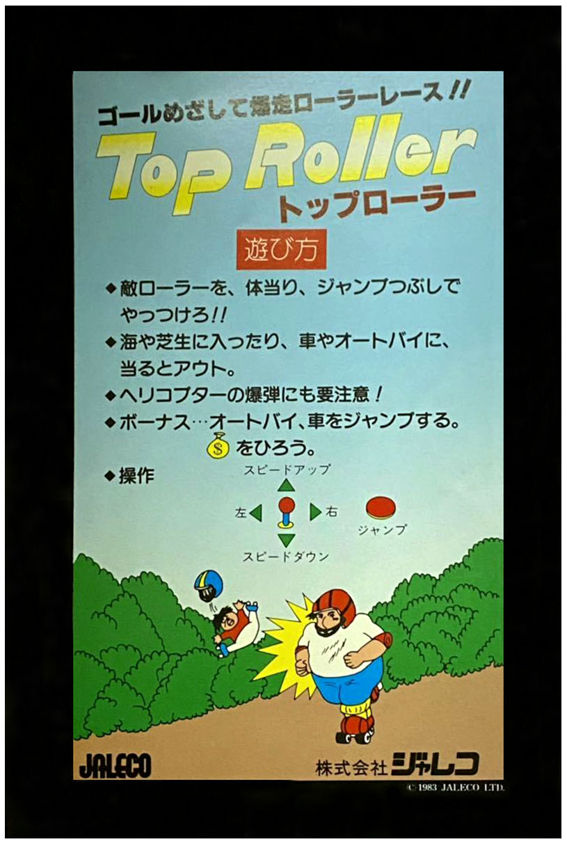 The Game Machine announcement for Top Roller refers to the control as a 4-way lever. The Japanese instruction card also illustrates the control as a 4-way lever. See attached images: top_roller_gm.jpg top_roller_card.jpg In MAME Top Roller is setup for an 8-way joystick, and the game does appear to allow these inputs, however the evidence I have may suggest that the game was intended to be played with the limitations of the 4-way control. In any event, when you watch long plays of the game, the skilled players are frequently slowing down to maneuver around the enemies (regardless of the control setup in the Jamma candy cab – the Natsuge video appears to be using an 8-way). While there is a small bonus for crossing the finish line with the best rank, it is really not worth the risk of trying to skate full speed the entire race. For example, you get a 500 point bonus for finishing 7th, and a 2000 point bonus for finishing 4th. etc. You could easily move more slowly and make up the point difference with a few well timed jumps over motorcycles. You get points for: Distance traveled Bumping enemy skaters off the course Jumping road vehicles Collecting money bags near the finish line If you play the game with a 4-way control, you can only sprint to full speed when not changing direction, and you quickly lose speed when not pressing UP. I think the rank that you finish the race has more to do with bumping other skaters off the road than it does with speed. For example, I tried enabling the invincibility cheat, and then holding UP while the game is unthrottled, and I was never able to finish higher than 4th because I was not bumping the other skaters. Below is a quick translation of the Game Machine write up from the game's release. Game Machine No. 221 – Oct. 01, 1983 (page 23) Roller Skater Jumping Body Strike Top Roller from Jaleco The TV game machine Top Roller with the theme of roller skating was released by Jaleco Co., Ltd. (Headquarters Tokyo, President Yoshiaki Kanazawa) on August 23rd. This machine was developed by Falcon Co., Ltd., and Jaleco Co., Ltd. acquired the rights in their entirety. Operate the roller skater with the 4-way lever (left/right, up for speed-up, down for speed-down) and the jump button. The skater skates along streets, lakes, rivers, bridges, etc., but there are always several enemy skaters obstructing them. The skater must either shake them off or hit them with his body to knock them to the edge of the road. Also, avoid trucks, cars, and motorcycles that appear suddenly from the front, or jump over them (high score). You can also jump over the river, but you can only jump as far as your speed allows. Also, watch out for bombs dropped from the sky by helicopters. When you reach the finish line in this way, you have completed one pattern, and the game gets more difficult as you progress to the next pattern. The score goes up according to the distance traveled and the number of enemies defeated. The game is over when 3 skaters are eliminated by hitting the edge of the road or an obstacle, but an additional skater is added if the score exceeds a certain level. The list price for the 18-inch table is 480,000 yen. The board is also available for sale (from August 29th) at a list price of 128,000 yen. |